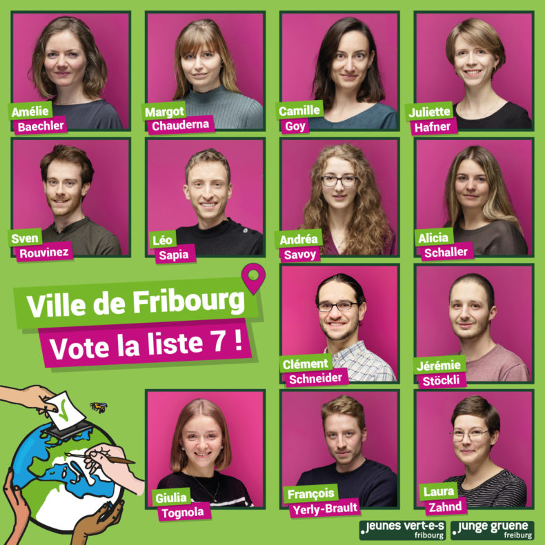 13 candidat·e·s de notre Liste sont également engagé·e·s chez les Jeunes Vert·e·s Fribourg, ils et elles représentent ainsi la plus grosse délégation de Jeunes Vert·e·s du canton.